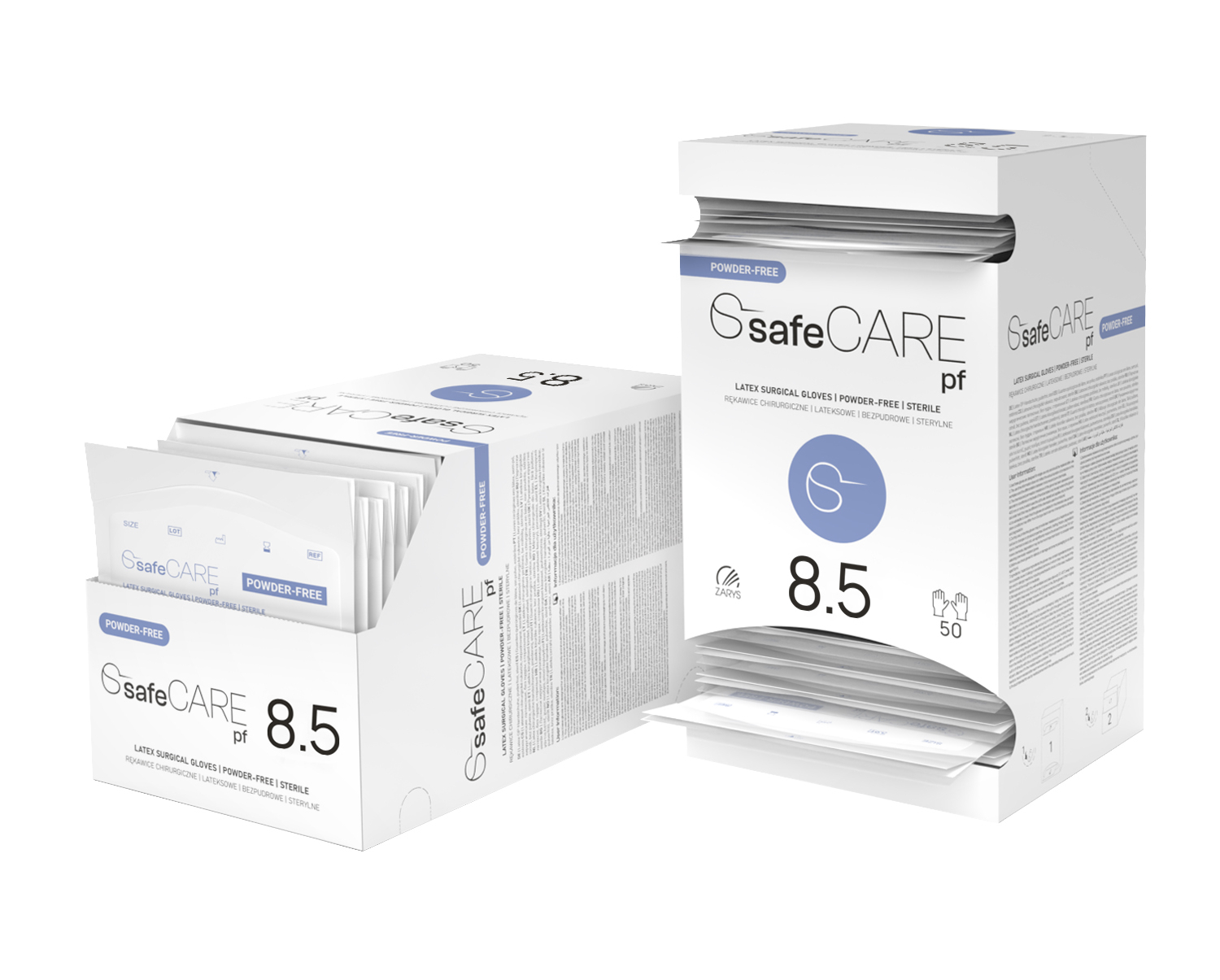 Rękawice chirurgiczne SafeCare są zapakowane w specjalny kartonik, który pełni również funkcję dyspensera. Jest wyposażony w dwa otwory — dolny, do wyjmowania rękawic i górny — żeby łatwo móc włożyć nieużyte rękawice z powrotem do opakowania. Dyspenser można otworzyć i używać zarówno w pionie, jak i w poziomie - będzie pasował do każdego gabinetu i sali zabiegowej. Innowacyjne pakowania rękawice SafeCare zapewniają łatwy dostęp i optymalne przechowywanie rękawic, co pomaga utrzymać wysoki standard higieny i bezpieczeństwa, chroniąc przed zanieczyszczeniami i kontaminacją. Kompaktowe opakowania pozwalają zredukować przestrzeń potrzebną do przechowywania i oznaczają niższe zużycie tektury, co przyczynia się do redukcji odpadów i mniejszego wpływu na środowisko.