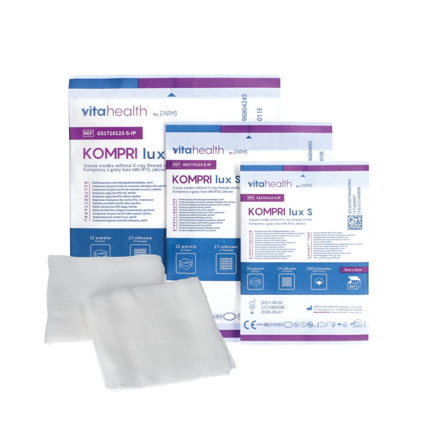 Kompresy gazowe pakowane po 3 sztuki indywidualnie pakowane KOMPRI lux S jałowe